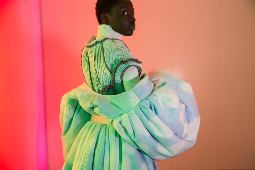 My fav look of the whole evening was part of the pastel-coloured collection of Jana, who created her own world driven by nostalgia and gratitude for the two worlds – Western and the Serbian – where she is at home. I fell in love with the dichotomy between voluminous shapes transforming bodies and the cheekiness of revealing skin. And of course this wonderful cloud print. Can I wear them, please?